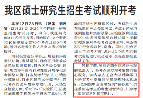 12月23日—25日,我校2024年全国硕士研究生招生考试组考工作圆满完成。在2024年全国硕士研究生招生考试报考人数近年来首次下降的情况下,我校通过持续深化研究生招生改革、精准实施招生政策解读、加大招生宣传力度及精准投放宣传资源等途径,吸引2024年一志愿报考我校考生6126人,同比增幅4.5%。我校报考点参加考试人数共2394人,学校设置标准化考场84个(含备用考场2个),多部门协同联动,全力保障考试顺利进行。 高度重视,周密部署 为全面做好研考组考工作,学校坚持研考也是育人的理念,积极多级联动,分级负责,专门成立了由校长郭喜担任组长,校领导赵增武、郝贠洪、王利明、刘利强任副组长的研究生招生考试工作领导小组,下设考务工作组、后勤保障工作组、校园安全工作组、网络保障工作组等8个工作组,成员单位包括党政办公室、党委宣传部、党委学生工作部、党委保卫部(保卫处)、教务处、研究生院、信息化建设与管理中心、后勤管理处等部门。学校研究制定《内蒙古工业大学2024年硕士研究生招生考试安全工作和组考实施方案》等“1+8”工作手册,抓实重点环节,部署考务工作,从考试命题、考务培训、考场安排和考试实施全过程进行指导,做到任务到岗、岗位到人、分工清晰、责任明确,有效保证了考试的顺利完成。 郭喜高度重视招生考试组考工作,亲自部署、亲自调度考试相关事宜。考前、考中多次亲临研考工作一线,专门指导相关部门做好招生考试工作,提出诸多优化组考工作的指导意见。郝贠洪考试期间全程检查指导,确保了2024年全国硕士研究生招生考试组考工作平稳有序地进行。 精心准备,温馨服务 为落实“平安研考”工作目标,研究生院组织监考人员及考务工作人员考前召开2024年全国硕士研究生招生考试培训会,学习相关法律法规及监考工作规程,培训监考注意事项,要求全体监考及考务工作人员全面熟悉掌握考试工作规程和各项工作要求后方可上岗,扎实做好研考工作。 学校各部门用情、用心、用力服务,做到“温馨研考”。研究生院、党委学工部加强宣传引导,通过内蒙古工业大学研究生院官网、内蒙古工业大学研究生教育官微、内蒙古工业大学学工在线等平台及时发布考生须知、考场规则、考风考纪公告等涉考温馨提示,使考生快速熟悉校区考场示意图、考点安检流程等考试信息,在各考试楼宇设置考试信息展板、考场指示标识、宣传横幅等为考生提供便利。 党委学生工部组织多种形式关心关爱活动,宣传教育部最新考试规则,组织学生考风考纪、诚信考试宣传教育活动。在各考试楼宇附近设置考生手机等电子信息设备寄存区域,由专人负责。 党委保卫部(保卫处)参与研考安保工作,严格规范落实研究生考试试卷押运和24小时值班工作,加强校区各考试区域安全检查,落实各考试楼宇的警戒工作,引导考生快速高效顺利进入考区。后勤管理处做好研考各项保障工作,考前全面检查考场各项基础设施运行情况,做好水、电、暖保供及考试区域环境卫生保洁工作,及时清理校园路面清雪。针对近期全区各地出现的低温天气,努力为考生提供暖心服务,为所有考生安排好午餐及暂时休息场所,为2400余名学生免费发放“定胜糕”,寓意“一‘研’为定,都能上岸”。 在校领导的高度重视和指导下,在各部门通力合作下我校圆满完成2024年全国硕士研究生招生考试考点工作,研考工作平稳、有序,实现了“三无、三稳、三确保”的工作目标!各项暖心服务活动受到了内蒙古日报、人民日报、北疆观察等媒体报道。 |